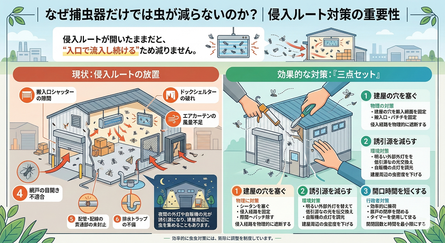 捕虫器だけでなく、侵入対策・清掃・温湿度管理とセットで設計しないと、再発リスクを抱えたままになります。