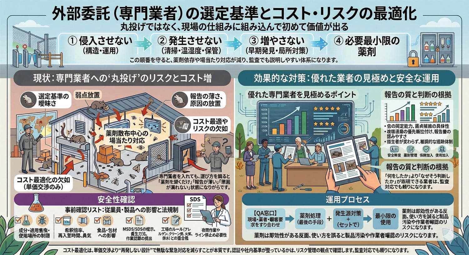 ここでは、良い業者の見極め、薬剤処理の安全性確認、費用対効果の考え方、業者と現場が噛み合う運用プロセスを解説します。