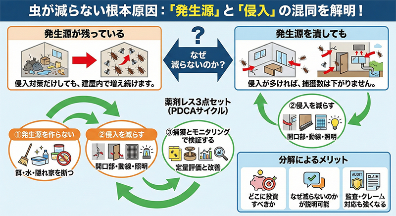 清掃や薬剤をしても虫が減らない原因の多くは、「発生源」と「侵入」を混ぜて考えていることです。
