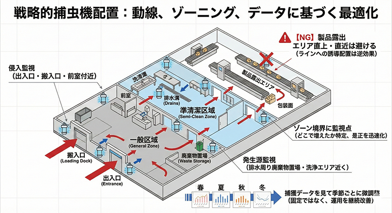 捕虫機は“置けば終わり”ではなく、設置目的(侵入監視か、発生源監視か)を決めて配置と運用を合わせる必要があります。