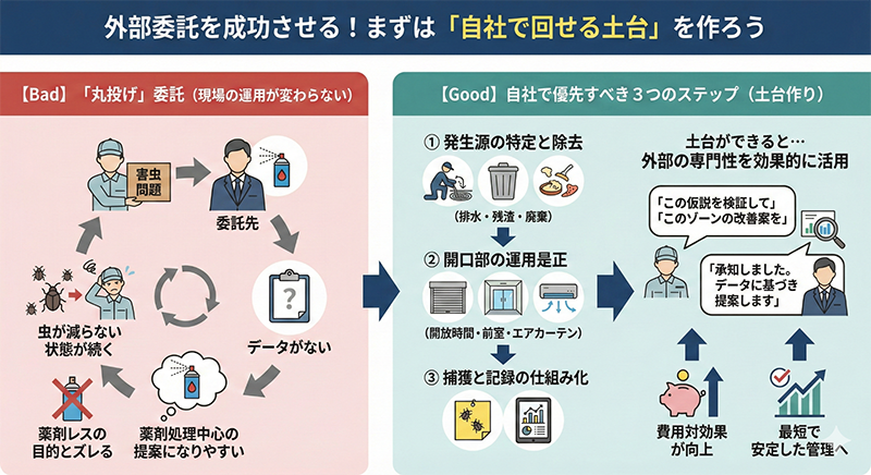 清掃は発生源除去、設備は侵入遮断と不具合修繕、捕獲は監視と検証、という役割を明確にし、点検表と是正フローを一本化します。