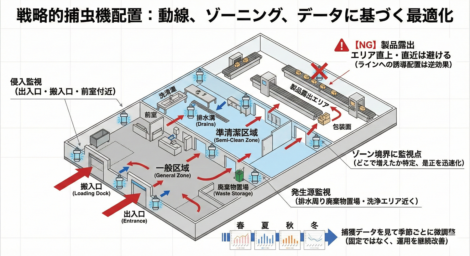 - ● 代わりにやること:発生源の特定(排水・残渣・原料由来)、侵入経路の封じ込み(開口部運用)、捕獲データの週次レビュー