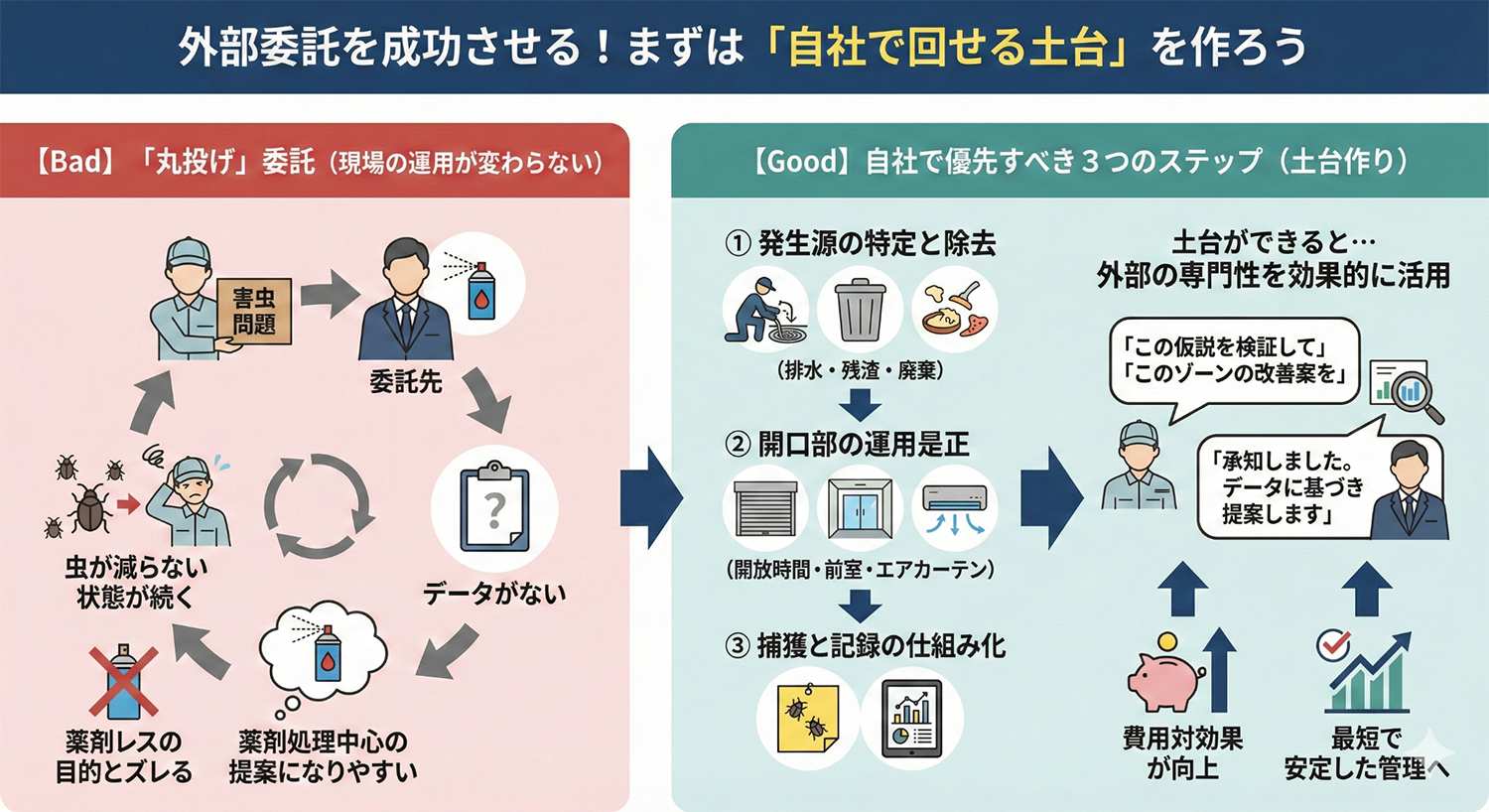 なぜなら、薬剤のように“撒いた感”で安心できない代わりに、データで増減を判断し、原因仮説→対策→検証を回す必要があるからです。